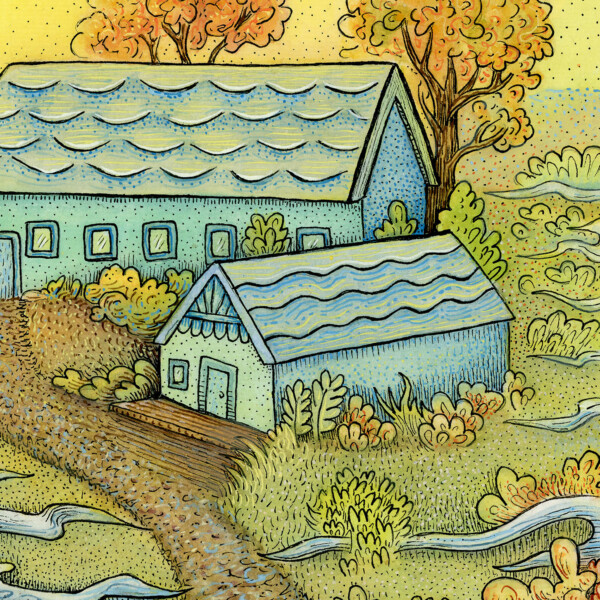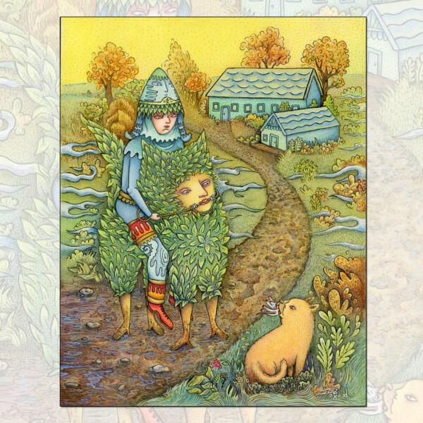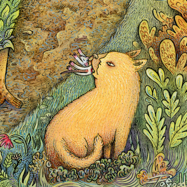 It’s a watercolor and gouache on mounted rice paper and is 11″ X 14″. I did the first layers much like a traditional Gongbi (Chinese meticulous style) painting, and did further detail layers with pen & ink and gouache.
