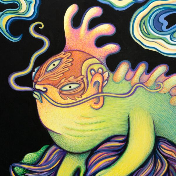 Star Lake is not referring to an irl lake, it just feels like the right way to describe this night time lake scene. To me, this painting depicts a pilot, who does fancy maneuvers before touching down on a lake at night. The bird represents the steering wheel, the lion is the airplane and the dragon is the wind they’re riding upon. Go ahead and create your own story about where she comes from and why she’s there.