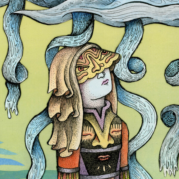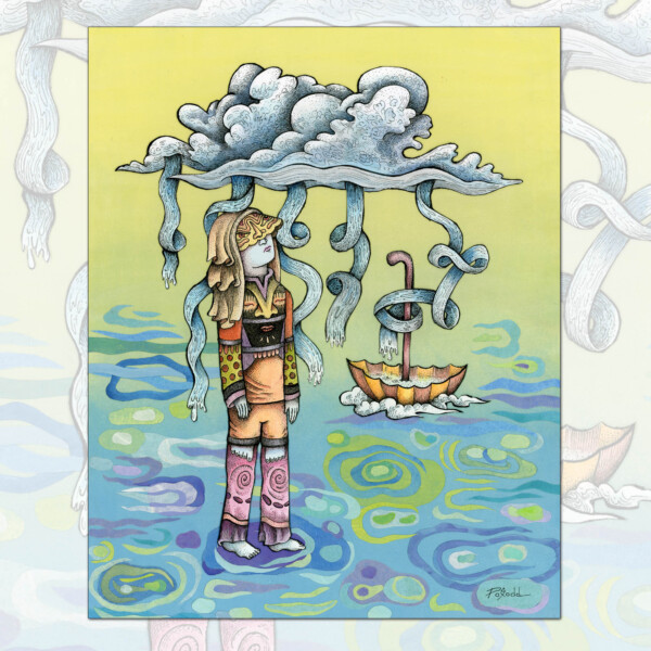 I recently finished this piece which is a bit of a mixed media/collage artwork. I did the main subject of the image as a pen and ink (on watercolor paper) and backed it with sticky mounting adhesive and then cut out, basically turning it into a giant sticker. I made the background separately, by painting a gradient onto the background and collaging on differently colored/painted mulberry and rice paper that I had cut into various shapes. It was a bit of an experiment since I felt it didn’t need much of an illustrated background and might be better with something a bit more abstract. I’m happy with how it turned out, the paper collage provides nice texture contrast to the pen and ink that I enjoy. Hope you enjoy it too!